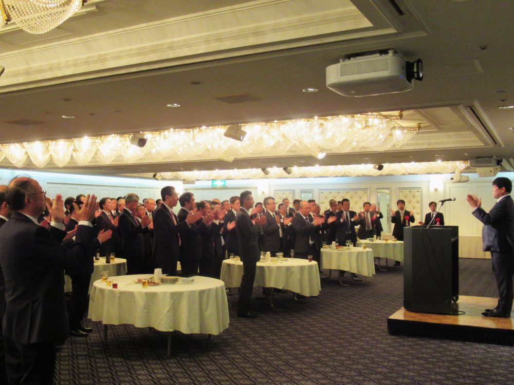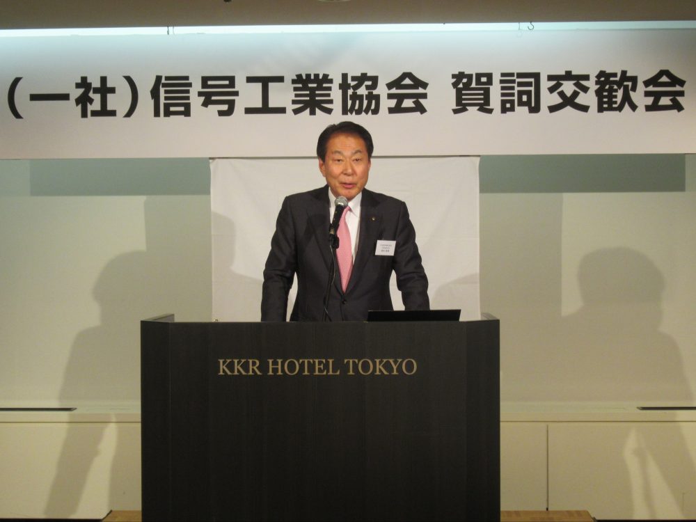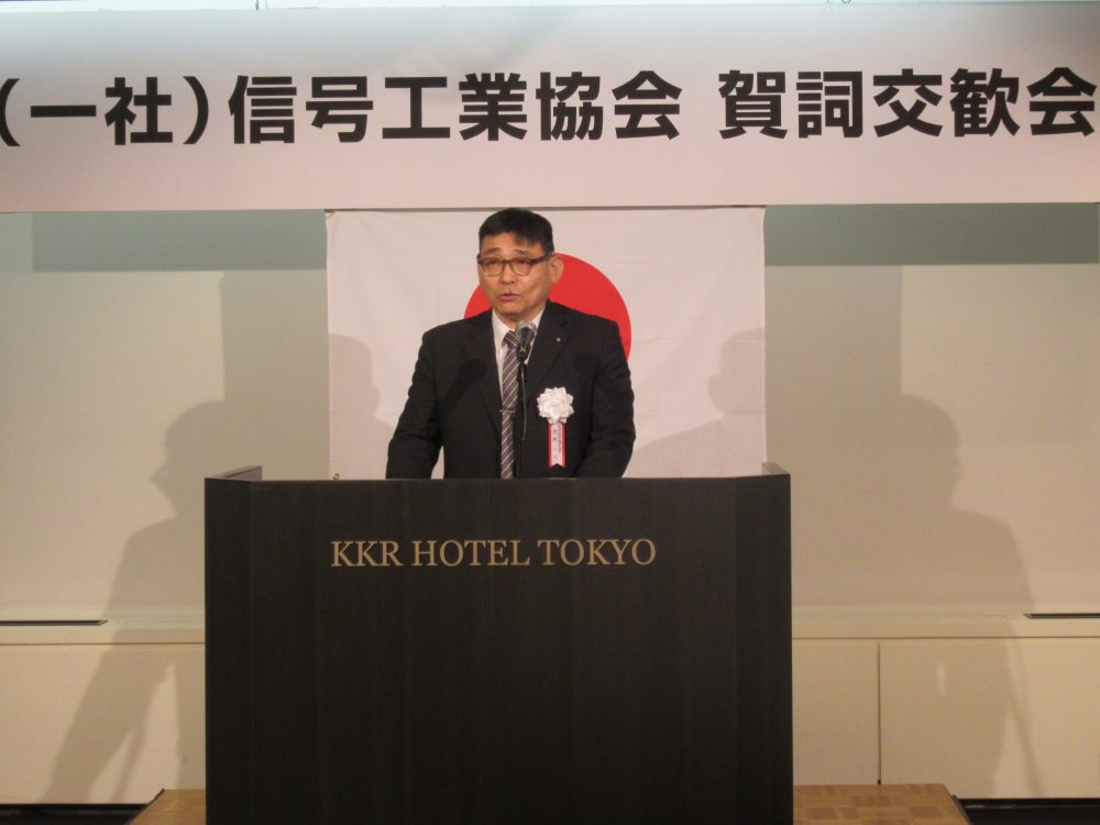 令和8年1月5日(月)KKRホテル東京「瑞宝の間」において、国土交通省、交通安全環境研究所等から多数の来賓の方々をお迎えして、昨年叙勲の栄に輝いた叙勲受章者や会員企業代表者など160名にて新年賀詞交歓会を開催した。冒頭、塚本英彦会長から挨拶が行われ、引き続き、権藤宗高国土交通省大臣官房技術審議官からご祝辞をいただいた後、國澤良治副会長の発声により乾杯が行われた。なごやかな歓談の後、徳野修一理事の中締めの挨拶により、盛会裏に終了した。