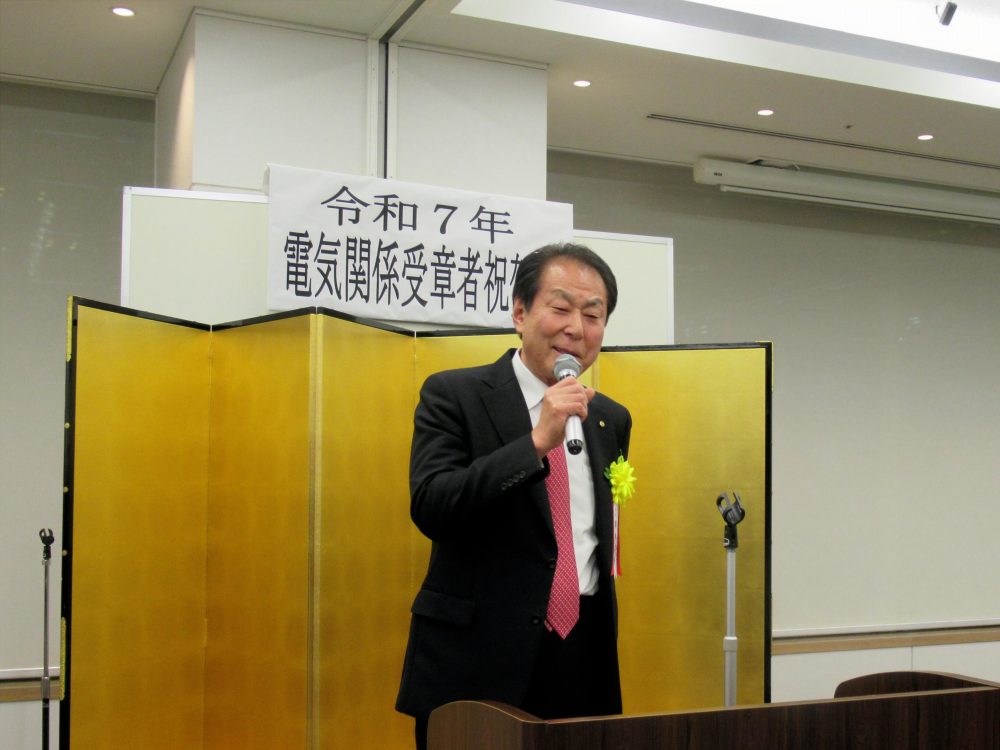 令和7年の電気関係受章者祝賀会は(一社)日本鉄道電気技術協会、(一社)鉄道電業安全協会、(一社)信号工業協会の電気関係3協会の共催で、12月11日にステーションコンファレンス東京(サピアタワー4F)で開催された。ご来賓(国土交通省、JR東日本、JR東海など)協会関係者などと、叙勲受章者6名、一般を含め約100名の参加者により盛大に開催された。信号工業協会の塚本会長の万歳三唱により、盛会裏に終了した。